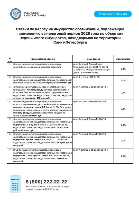 Ставки по налогу на имущество организаций, подлежащие применению за налоговый период 2026 года по объектам недвижимого имущества, находящимся на территории Санкт-Петербурга