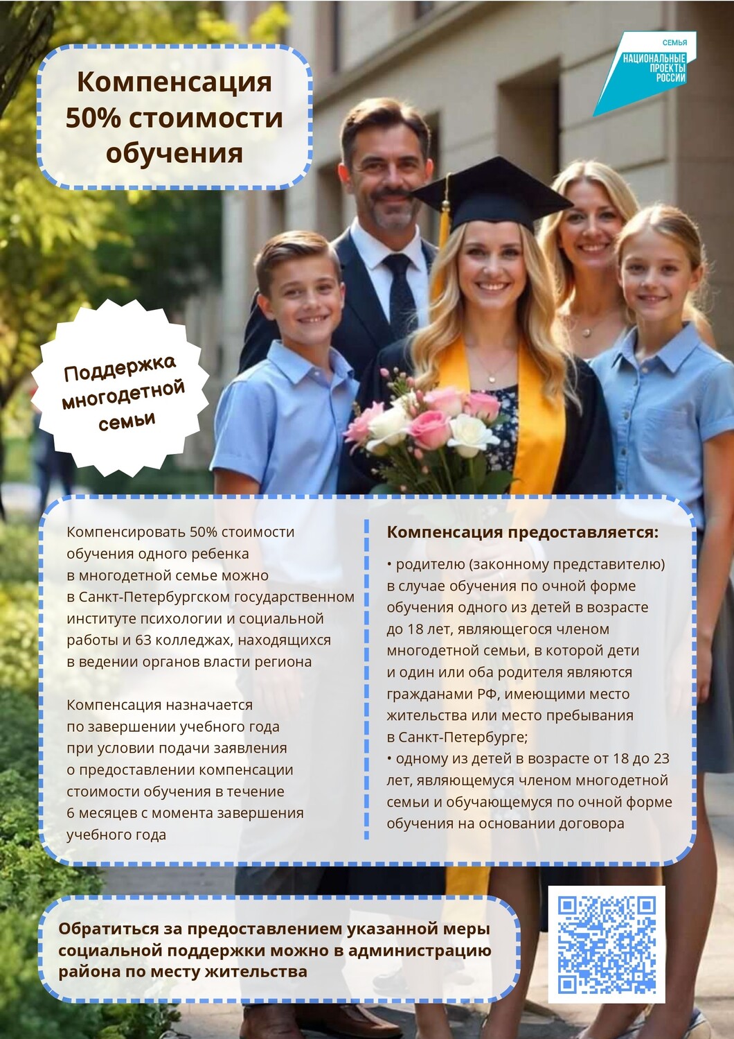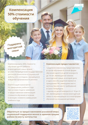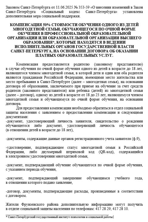 Законом Санкт-Петербурга от 11.06.2025 № 353-59 «О внесении изменений в Закон Санкт-Петербурга «Социальный кодекс Санкт-Петербурга» установлена дополнительная мера социальной поддержки. КОМПЕНСАЦИЯ 50% СТОИМОСТИ ОБУЧЕНИЯ ОДНОГО ИЗ ДЕТЕЙ МНОГОДЕТНОЙ СЕМЬИ, ОБУЧАЮЩЕГОСЯ ПО ОЧНОЙ ФОРМЕ ОБУЧЕНИЯ В ПРОФЕССИОНАЛЬНОЙ ОБРАЗОВАТЕЛЬНОЙ ОРГАНИЗАЦИИ ИЛИ ОБРАЗОВАТЕЛЬНОЙ ОРГАНИЗАЦИИ ВЫСШЕГО ОБРАЗОВАНИЯ*, КОТОРЫЕ НАХОДЯТСЯ В ВЕДЕНИИ ИСПОЛНИТЕЛЬНЫХ ОРГАНОВ ГОСУДАРСТВЕННОЙ ВЛАСТИ САНКТ-ПЕТЕРБУРГА, НА ОСНОВАНИИ ДОГОВОРА ОБ ОКАЗАНИИ ПЛАТНЫХ ОБРАЗОВАТЕЛЬНЫХ УСЛУГ. | |