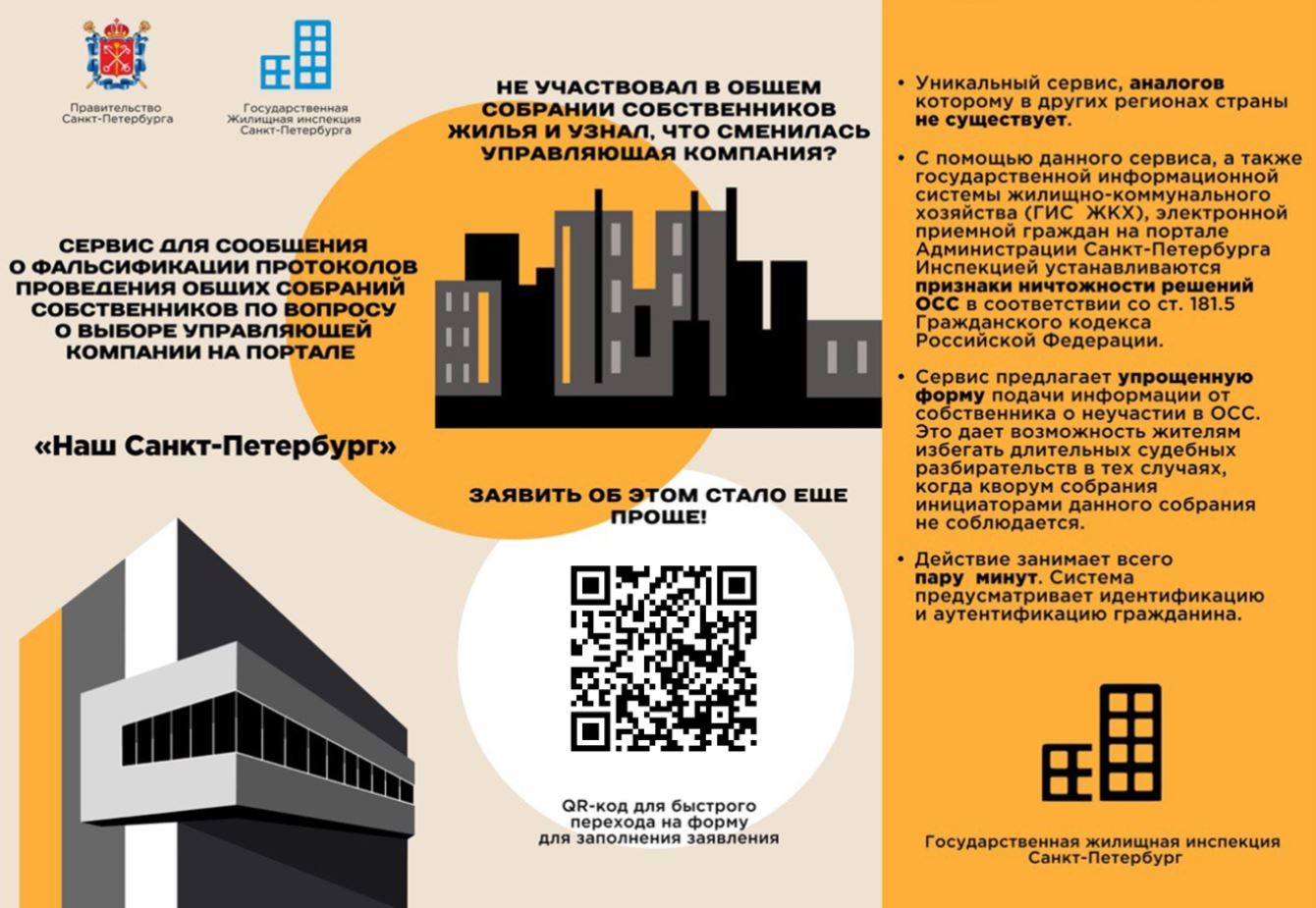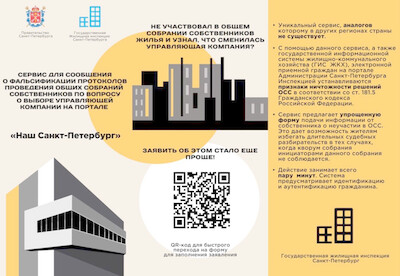 С 16.10.2025 реализована возможность для граждан подать обращение о фактах искажения волеизъявления собственника помещения в многоквартирном доме, содержащегося в решениях и протоколе общего собрания собственников помещений в многоквартирном доме по вопросу выбора, изменения способа управления многоквартирным домом, принятия решения о заключении и (или) расторжении договора управления многоквартирным домом, поданных гражданами посредством электронного сервиса «Сообщение о фальсификации участия в выборе управляющей организации» на портале «Наш Санкт Петербург» в любом подразделении СПб ГКУ «Многофункциональный центр предоставления государственных и муниципальных услуг» (за исключением центров оказания услуг для бизнеса, специализированных и мобильных офисов). | |
