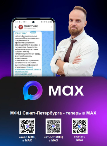 Ссылка: http://https://max.ru/spb_mfc_bot Ресурсы, реализованные на платформе МАХ Канал Губернатора Санкт-Петербурга А.Д.Беглова https://max.ru/a_beglov Канал Правительства Санкт-Петербурга https://max.ru/spb Канал МФЦ Санкт-Петербурга https://max.ru/spbgkumfc Канал «Я здесь живу» https://max.ru/ya_zdes_zhivu Канал Оповещение населения Санкт-Петербурга https://max.ru/opovspb Чат-бот Служба 122 Санкт-Петербурга, запись к врачу https://max.ru/spb_122_bot Чат-бот Госуслуги Санкт-Петербурга https://max.ru/spb_gosuslugi_bot Чат-бот МФЦ Санкт-Петербурга https://max.ru/spb_mfc_bot Чат-бот для оплаты школьного питания https://max.ru/glolime_bot Аккаунты экстренных и специальных служб: Служба экстренных вызовов 112 (+79313261-112) Информационно-справочная служба 122 (+79313261-122) Служба 117 (+79313276-117) Служба 004 (+79313279-004). | |